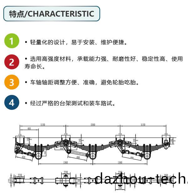 68轻型悬挂系列特点:1、轻量化的设计,易于安装、维护便捷。2、选用高强度材料,承载能力强、耐磨性好、稳定性高、使用寿命长。3、车轴轴距调整方便、准确,避免轮胎吃胎。4、经过严格的台架测试和装车路试。