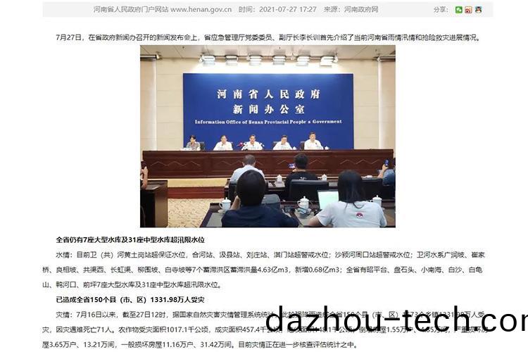 据河南省政府发(fa)布,强降水造成7月16日以来,截至27日12时,据自(zi)然灾害灾情管理系统统(tong)计,此轮强(qiang)降雨造成全省150个县(市、区(qu))1573个乡镇1331.98万人受灾,因灾遇难死亡71人。农作物(wu)受灾面积1017.1千公顷,成灾面积457.4千公顷,绝收面积148.1千公顷;倒(dao)塌(ta)房屋1.55万户、4.85万间,严重损坏房屋3.65万户、13.21万间,一般损坏房屋11.16万户、31.42万间。